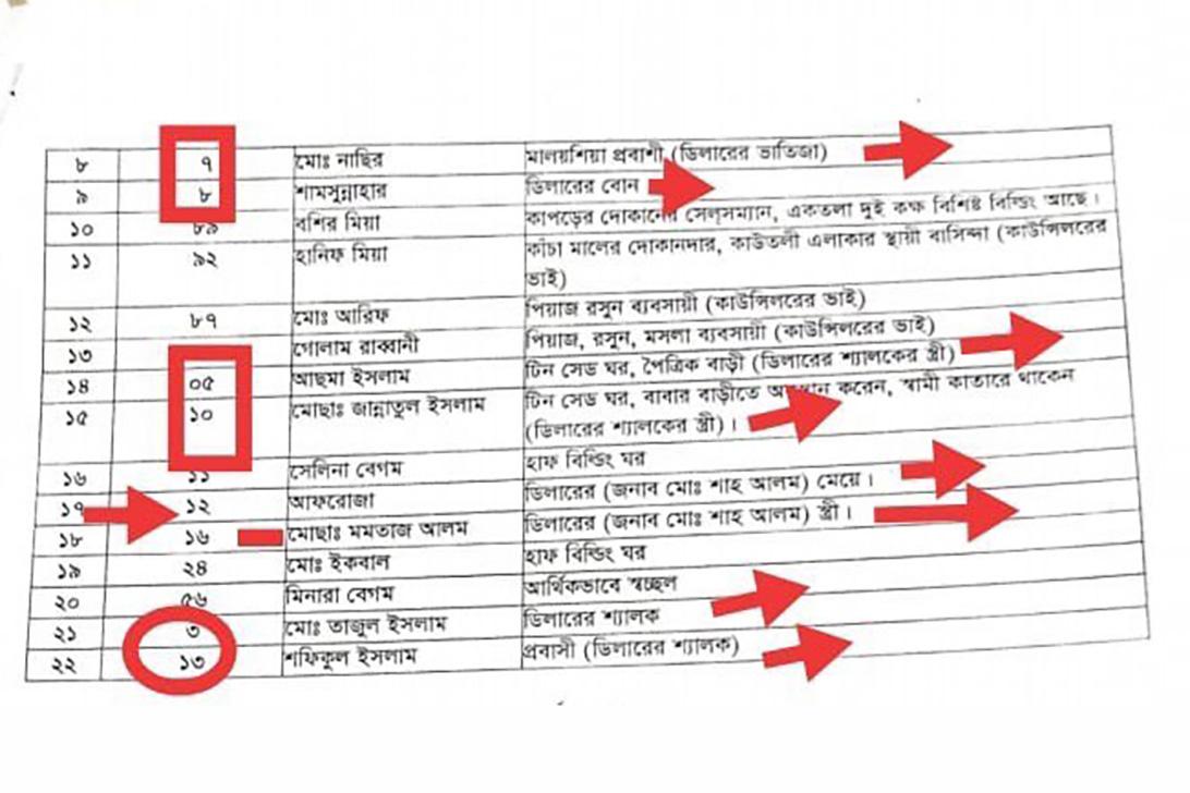এই ওয়ার্ডের তালিকায় ৮৭, ৯২ ও ৯৪ নম্বরে রয়েছে ওয়ার্ড কাউন্সিলর মো. মকবুল হোসেনের তিন ভাই মো. আরিফ, মো. হানিফ ও মো. গোলাম রাব্বীর নাম।