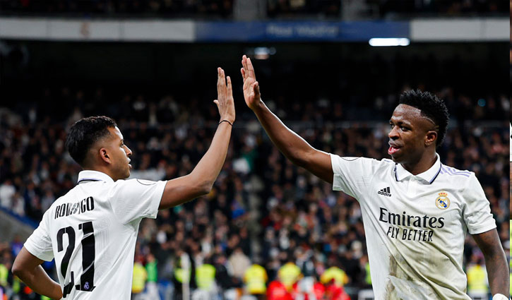 পিছিয়ে থেকেও অ্যাটলেটিকোকে উড়িয়ে সেমিফাইনালে রিয়াল শেষ বাঁশি বাজতে মিনিট দশেক বাকি। তখন পিছিয়ে থাকা রিয়াল মাদ্রিদের ত্রাতা হয়ে আসেন ব্রাজিলিয়ান রদ্রিগো। মাঝ মাঠের একটু সামনে থেকে একাই বল নিয়ে অসাধারণ কারিকুরিতে রদ্রিগো বল জড়িয়ে দেন অ্যাটলেটিকো মাদ্রিদের জালে। এরপর শুধু লস ব্লাঙ্কোসদের কতৃত্বের গল্প। বাকি কাজ সেরে দেন করিম বেনজেমা-ভিনিসিয়াস জুনিয়র।
