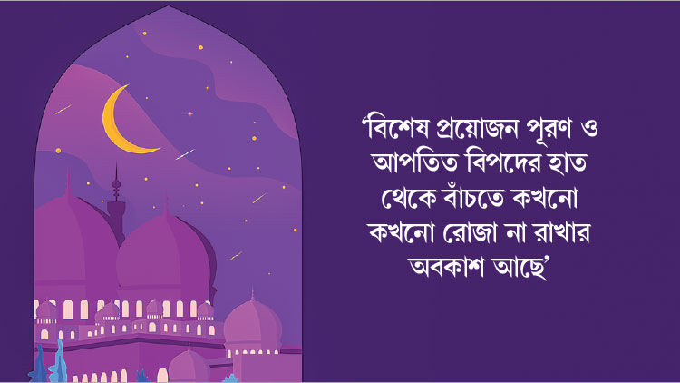 অনিবার্য কারণে : বিশেষ প্রয়োজন পূরণ ও আপতিত বিপদের হাত থেকে বাঁচতে কখনো কখনো রোজা না রাখার অবকাশ আছে। যেমন ডুবে যাওয়া বা আগুনে পোড়া ব্যক্তির চিকিৎসা রোজা ভঙ্গ না করলে করা সম্ভব হয় না। তবে এমন ব্যক্তিও পরবর্তী সময়ে রোজা কাজা করবে। হজরত আবু সাঈদ খুদরি (রা.) বলেন, ‘আমরা হজরত রাসুলুল্লাহ (সা.)-এর সঙ্গে রোজা রেখে মক্কার উদ্দেশে সফর করেছিলাম। আমরা একজন এক জায়গায় যাত্রাবিরতি দিলাম, তখন হজরত রাসুলুল্লাহ (সা.) বলেন, ‘তোমরা তোমাদের শত্রুর নিকটবর্তী হয়েছ। রোজা ভঙ্গ করাই তোমাদের শক্তি বৃদ্ধি করবে।’ সহিহ মুসলিম : ১১২০