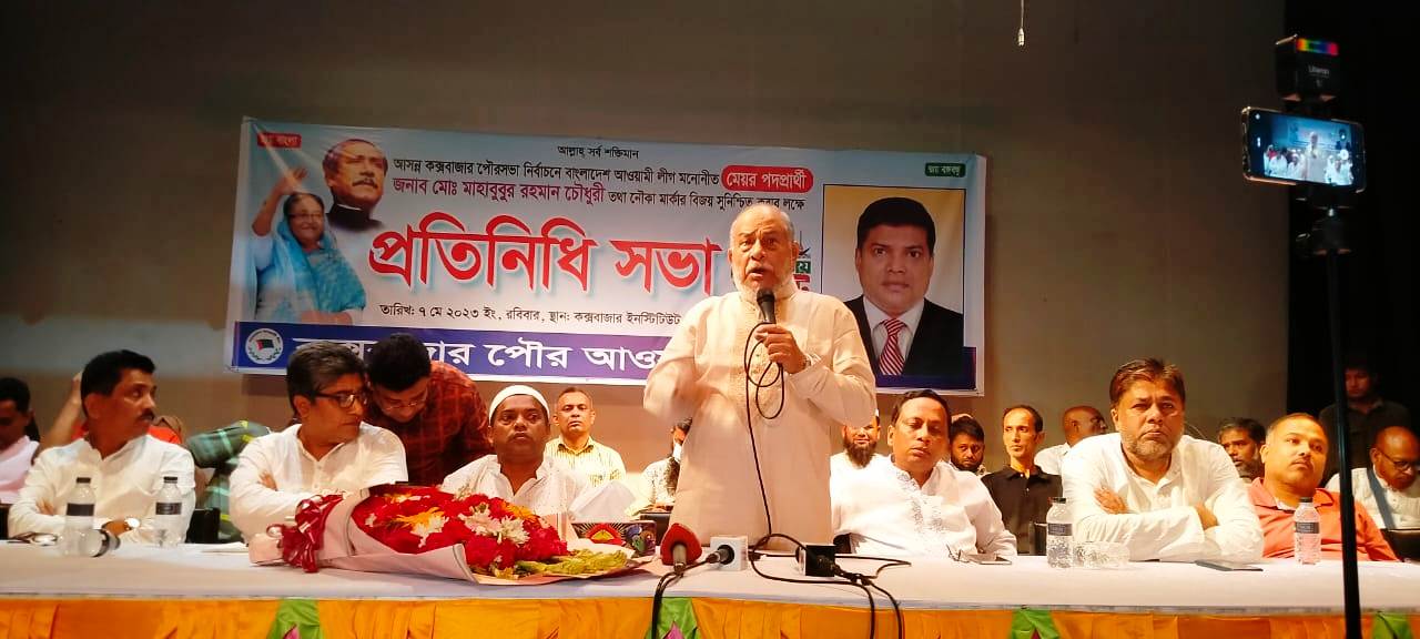 আগামি ১২ জুন অনুষ্ঠিততব্য কক্সবাজার পৌরসভার নির্বাচনে আওয়ামীলীগ মনোনীত নৌকা প্রতিকের প্রার্থী মো. মাহাবুবুর রহমান চৌধুরীর বিজয় সুনিশ্চিত করার লক্ষে আয়োজিত প্রতিনিধি সভায় প্রধান অতিথির বক্তব্যে এডভোকেট ফরিদুল ইসলাম চৌধুরী বলেন, আওয়ামীলীগের ক্ষমতা সময় নৌকা প্রতিকের মেয়র হিসেকে মুজিব নির্বাচিত হওয়ায় গত ৫ বছরের পৌরসভার উন্নয়নের দৃশ্য বদলে গেছে। এ উন্নয়ন ধারাবাহিক রাখতে হলে শেখ হাসিনার মনোনীত মাহাবুবুর রহমানকে বিজয় করতে হবে। এখানে বিকল্প বা বিদ্রোহীদের চিন্তা করার কোন সুযোগ নেই। নৌকা যার, আওয়ামীলীগ তার। নৌকার বিরোধীতাকারিরা আওয়ামীলীগের কেউ হতে পাবে না।