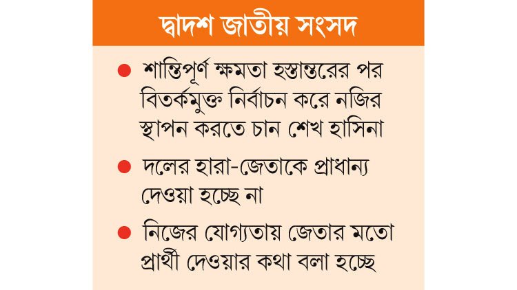 সংসদের বাইরে থাকা বড় বিরোধী দল বিএনপি আন্দোলন ও বিদেশিদের চাপের মুখে প্রধানমন্ত্রী শেখ হাসিনা বারবারই সুষ্ঠু ও অবাধ নির্বাচনের অঙ্গীকার ব্যক্ত করে আসছেন। বিষয়টি যে কথার কথা নয়, সেটাও আওয়ামী লীগের দলীয় ফোরামে বারবার আলোচনায় আসছে। দলীয় সূত্রগুলো বলছে, দ্বাদশ সংসদ নির্বাচনে আওয়ামী লীগের হারা-জেতার চেয়ে অবাধ, সুষ্ঠু ও নিরপেক্ষ নির্বাচন আয়োজনকেই এবার গুরুত্ব দিচ্ছেন প্রধানমন্ত্রী। দলীয় সরকারের অধীনে বিতর্কমুক্ত নির্বাচন অনুষ্ঠানকে চ্যালেঞ্জ হিসেবে নিয়েছেন তিনি। কারণ, তার অধীনে নির্বাচন সুষ্ঠু করে নজির স্থাপন করতে চান ক্ষমতাসীন দলের সভাপতি।