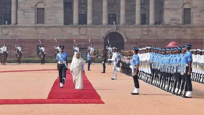 ভারত সফরের দ্বিতীয় দিনে আজ শনিবার সকালে ফোরকোর্টের রাষ্ট্রপতি ভবনে বাংলাদেশের প্রধানমন্ত্রী শেখ হাসিনাকে লাল গালিচা সংবর্ধনা দেওয়া হয়েছে । এ সময় শেখ হাসিনা সশস্ত্র সালাম গ্রহণ ও গার্ড অব অনার পরিদর্শন করেন।