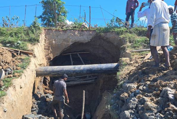 রাস্তা কেটে মাছের ঘেরে পানি দিচ্ছেন মৎস্যজীবী আবুবক্কর
