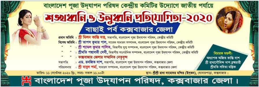 বাংলাদেশ পূজা উদ্যাপন পরিষদ কেন্দ্রীয় কমিটির উদ্যোগে জাতীয় পর্যায়ে অনুষ্ঠিত হচ্ছে শঙ্খধ্বনি ও উলুধ্বনি প্রতিযোগিতা। এরই অংশ হিসেবে কক্সবাজার জেলার বাছাই পর্ব অনুষ্ঠিত হবে শুক্রবার (১১ সেপ্টেম্বর)।